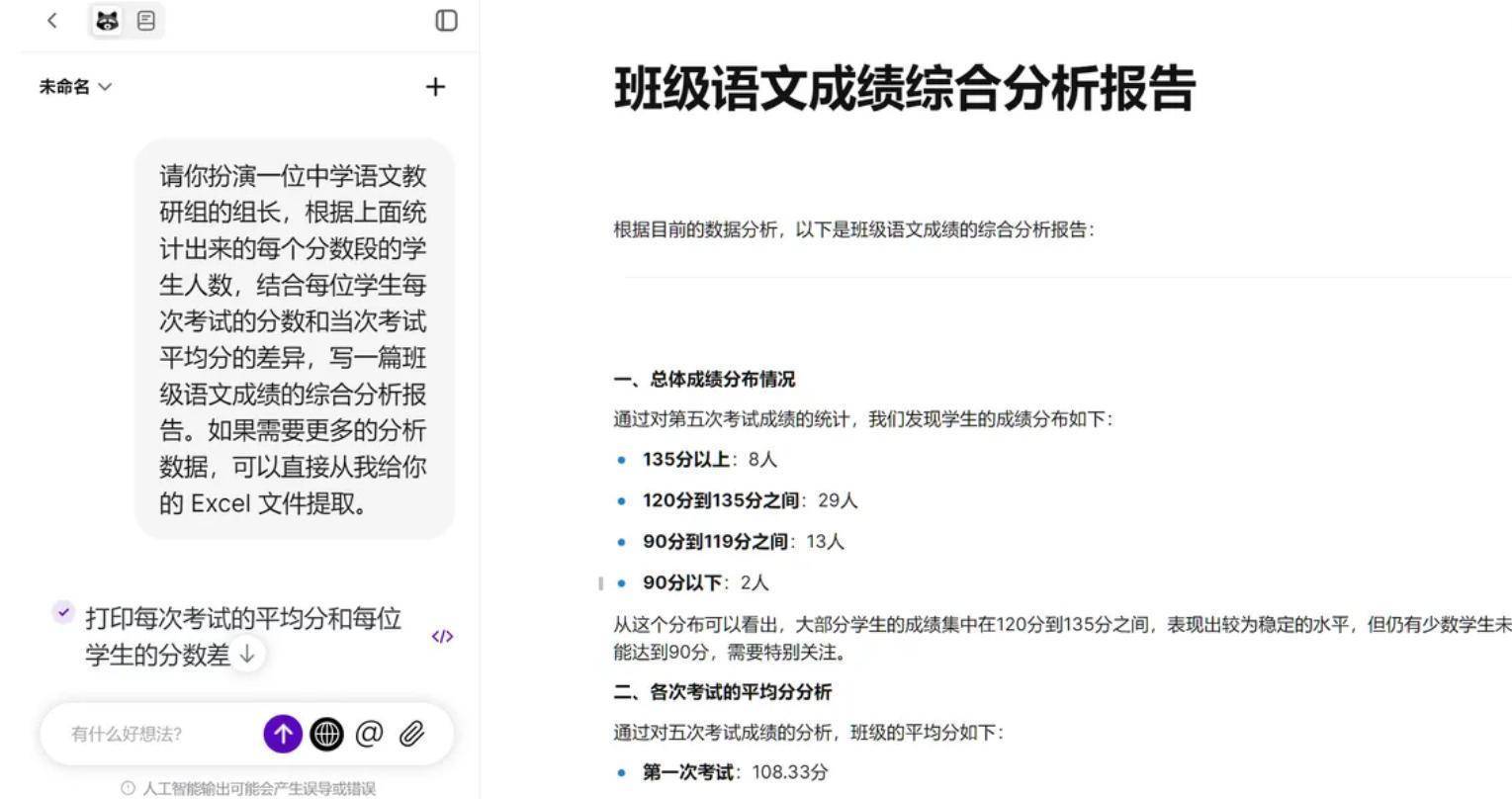 “我爱人是班主任,还需要在每周的语文学科教研会上就本班语文成绩进行汇报。以前这种汇报稿都是她人工起草的,现在我们也可以拜托小浣熊帮助分析,起草一份简单的语文成绩分析报告。”汪先生说。