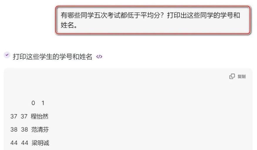 用户接着提问:有哪些同学五次考试都低于平均分?