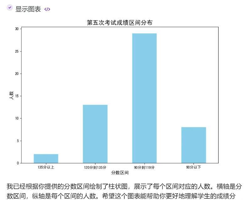 除了数字统计之外,老师还需要以各种图表的形式,给家长呈现各分数段的学生分布情况。这对小浣熊来说,也是毫不费力。