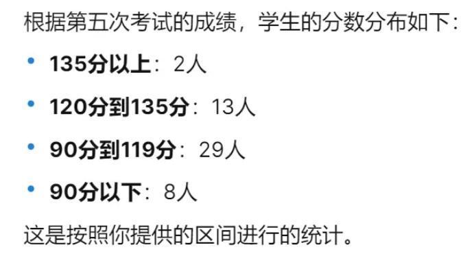 用户继续提问:请针对第5次考试的成绩,将学生的分数按照135分以上、120分到135分之间(含120分)、90分到119分之间(含90分)以及90分以下这四个区间,统计每个区间的人数。