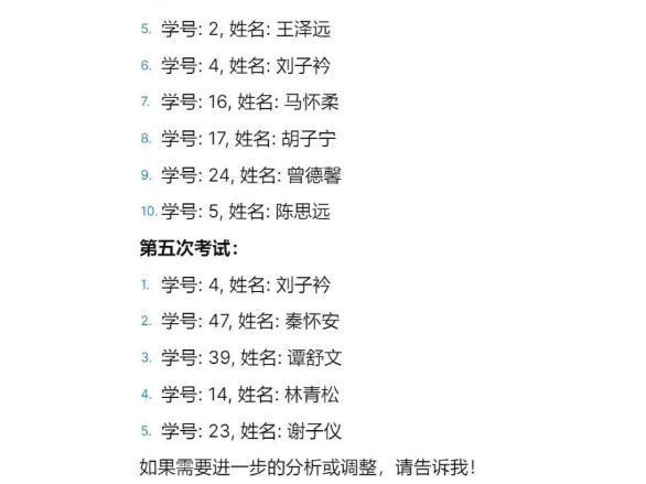 于是,接着提问:请将这5次考试班上排名前十位的同学名单分别列出来,要求包含学号和姓名。
